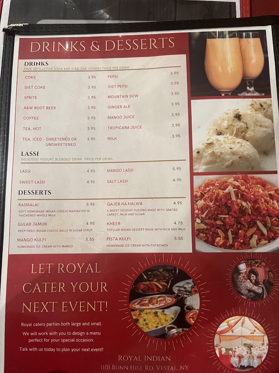 Royal Indian Bar and Grill, located at 1101 Bunn Hill Rd, Vestal, NY, offers a vibrant dining experience steeped in authentic Indian cuisine. With a menu that delights both vegetarian and non-vegetarian palates, diners can savor dishes like the flavorful Lamb Kashmiri and Goa Fish Curry, alongside mouthwatering appetizers such as Pani Puri and Dahi Bhalla. The warm ambiance and attentive staff enhance the overall experience, making it a beloved spot for families and food enthusiasts alike. From the bustling bar area to the exquisite flavor profiles, each visit promises a memorable culinary journey that captures the essence of Indian culture.